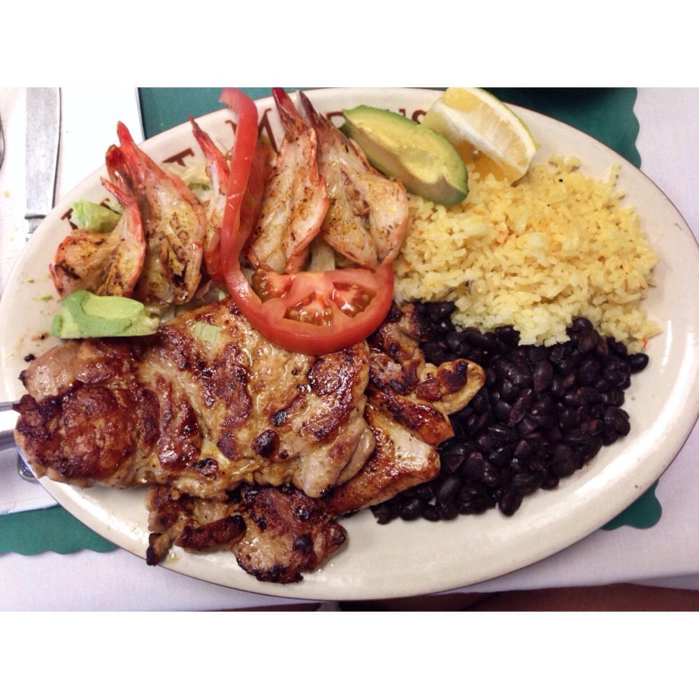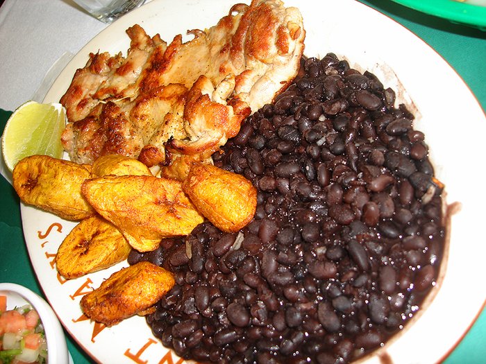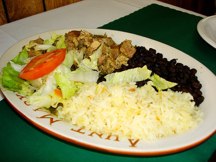 Choice of meat: Pollo asado(grilled chicken), carne asada(steak),chile verde(pork in green sauce), carnitas(roasted pork). Choice of beans: Refried beans, pinto beans, black beans. Extra meat $2.50
