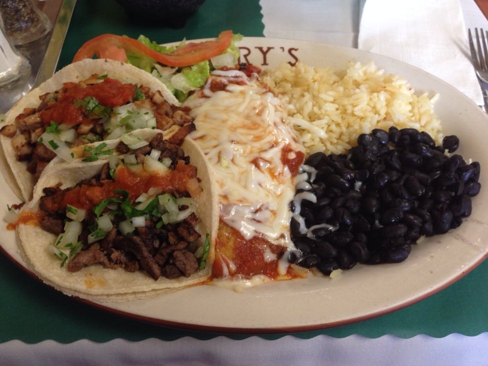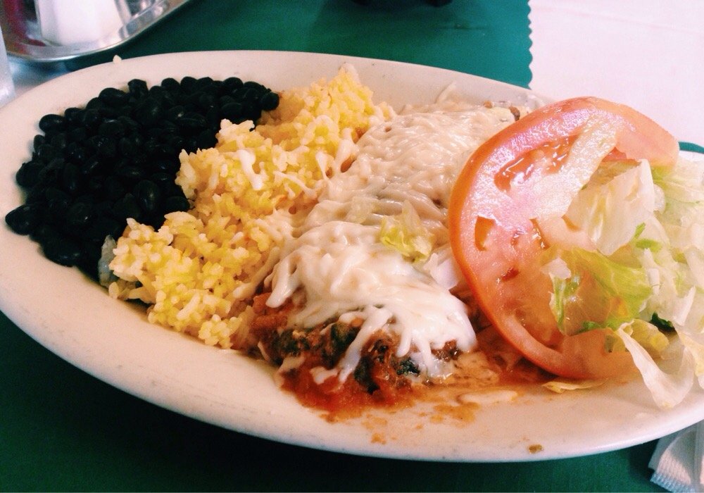 (Choice of meat: Steak, chicken, roast pork, chile verde pork in green sauce. Choice of beans: Refried beans, pinto beans, black beans.)